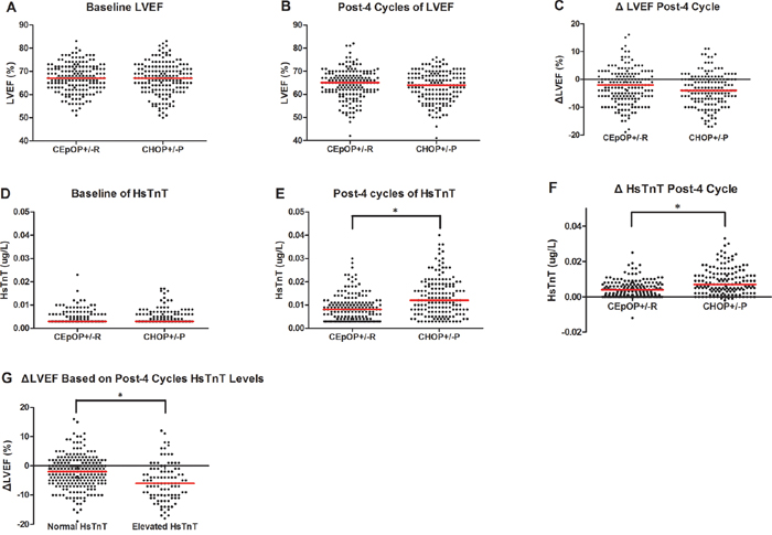 LVEF assessments were performed at baseline, after the completion of 4 cycles of either CHOP+/-R or CEpOP+/-R, and subsequently at the discretion of the treating physician by MUGA scan (GE infinia; Software version: Xeleris 3.0423). We chose this time frame to evaluate cardiotoxicity as early as possible in order to have the option of switching to a non-anthracycline regimen. All MUGA scan studies were analyzed by the same cardiologist (BZ). In addition, serum samples were collected for TnT measurements at the time of enrollment and after 4 cycles of therapy. Samples were sent to the FUSCC central laboratory, frozen, and stored at -80°C until analysis was performed. Hemolyzed or insufficient samples were excluded. Investigators performing serum assays remained blinded throughout the study. Serum TnT concentrations were measured using the high-sensitivity cardiac TnT (HsTnT) one-step electrochemiluminescence immunoassay (Roche cobase 411) as previously described [21]. The sensitivity and specificity of the assay were 99% and 98%, respectively. The threshold for an abnormally elevated value using this method is 0.014μg/L, and the range of detection extends from 0.003 to 1000 μg/L [21].