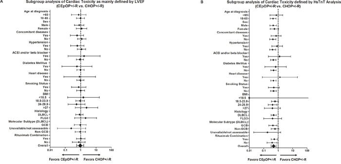 Abbreviation: HsTnT = high sensitive serum cardiac troponin T; CEpOP+/-R = cyclophosphamide, epirubicin, vincristine and prednisone +/- rituximab; CHOP+/-R = cyclophosphamide, doxorubicin, vincristine, and prednisone +/- rituximab; LVEF = left ventricular eject fraction; ACEI = angiotensin converting enzyme inhibitors; BMI = body mass index; DLBCL = diffuse large B cell lymphoma; FLG3 = follicular lymphoma grade 3; GCB = germinal center B-cell-like.