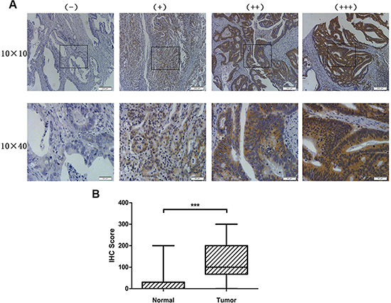 Figure 1: HOXC6 was highly expressed in CRC tumor tissues. Representative images of HOXC6 IHC staining intensity: (−) no staining; (+) weak staining; (++) moderate staining; (+++) strong staining (A) HOXC6 IHC staining score was significantly higher in tumor tissues than in normal tissues (B) ***P < 0.001 via Wilcoxon signed rank test (matched pairs).