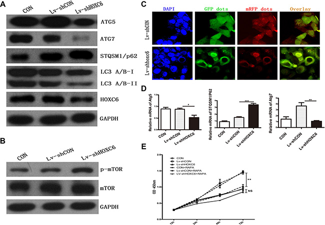 Figure 5: HOXC6 downregulation inhibited autophagy. Following HCT116 cell infection with LV-shHOXC6 or LV-shCON, autophagy genes were analyzed by western blotting (A) mTOR pathway activity was detected by western blotting (B) Representative immunofluorescent images showing LC3 staining in cells infected with mRFP-GFP-LC3 adenovirus (nuclei are stained with DAPI) (C) Scale bar, 10 μm. Autophagy-related gene mRNA levels were detected by RT-PCR (D) The viability of HOXC6-downregulated cells treated with an autophagy activator was measured via CCK-8 assay (E).