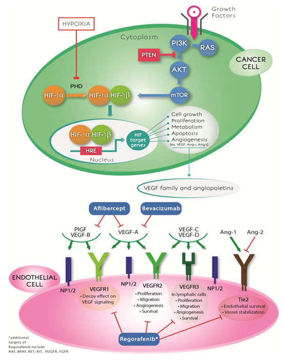In particular, angiogenesis targeting via the vascular endothelial growth factor (VEGF) pathway has raised the attention of clinicians, considering the favourable survival benefit given by bevacizumab (Bev) in clinical trials in both first [2] and second line [3] settings. More recently, large phase III studies have shown clinical efficacy also in the new anti-angiogenic agents Ziv-aflibercept [4] and regorafenib [5]. However, benefits of angiogenesis inhibitors (AI) in an unselected patient population are modest. To date the research of predictive biomarkers has been unsuccessful and the mechanisms of resistance to such agents are unknown [6]. Induction of hypoxia represents a constant event during treatment with an antiangiogenic drug, and it is, in turn, a mechanism responsible for resistance to therapy.