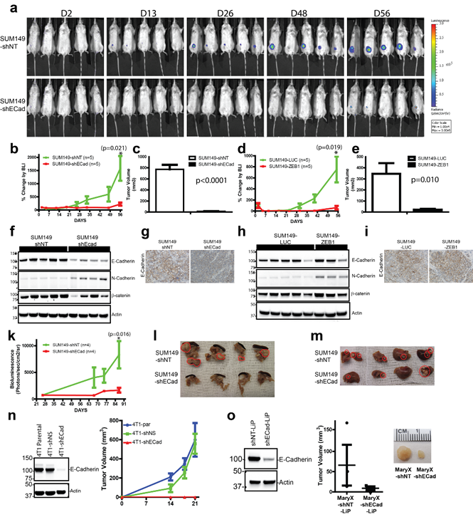 Figure 4: E-Cadherin is required for in vivo growth of SUM149, Mary-X and 4T1 breast cancer cell lines. (a) Longitudinal bioluminescent imaging (BLI) of SUM149-shNT and SUM149-shECad cells growth in MFP. Similar results were obtained with SUM149-LUC and SUM149-ZEB1 clones. (b,d) M-SUM149 clones display reduced in vivo growth capacity. Five hundred thousand of E-SUM149 or M-SUM149 clones were implanted into MFP and BLI was measured to monitor tumor growth. BLI was performed on a weekly basis for 8 weeks. Five mice per group was used. Similar results were obtained when 50,000 cells were used (data not shown). (c,e) Reduced tumor volume of M- SUM149 clones when compared to E-SUM149 clones 8 weeks post implantation (n=5). (f,h) Western blot validation of xenograft tissue cell extract from E-SUM149 and M-SUM149 clones. SUM149-shECad tumors maintained their reduced E-Cadherin expression while retaining N-Cadherin expression. Additionally, β-catenin expression levels were correlated with E-Cadherin expression. (g) Based on immunohistochemical staining, reduced E-Cadherin staining was maintained in SUM149-shECad. (i) Immunohistochemical staining of E-Cadherin protein on SUM149-LUC and SUM149-ZEB1 tumor tissues. E-Cadherin expression was retained in the SUM149-ZEB1 tumor tissue similar to the result observed by western blot. (k) BLI of tumor burden in intra-cardiac injection metastatic model. E-Cadherin expression in SUM149 cells is required for metastatic colonization. Longitudinal study of metastatic burden of SUM149-shNT (n=4) and SUM149-shECad (n=4). Decrease metastatic foci in pancreas (l) and liver (m) of SUM149-shECad injected mice. Tumors localization within the tissues are traced in red. (n, left) Western blot showing efficient knockdown of E-Cadherin in 4T1-shECad cells. (n, right) Dramatic reduction of MFP in vivo growth of 4T1-shECad cells compared to either 4T1 parental or control 4T1-shNS. (o, left) Efficient knockdown of E-Cadherin using the modified pLKO-LiP vector backbone. (o, right) Reduced in vivo growth of Mary-X-shEcad-LiP cells compared to Mary-X-shNT-LiP