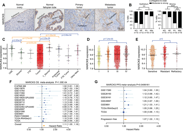 Figure 2: Immunohistochemical staining of MARCKS in ovarian tissues and its clinical relevance. A. Immunohistochemistry (IHC) detection of MARCKS in a series of ovarian tissues including normal ovaries, normal fallopian tubes, paired primary and metastatic tumor tissues of high grade EOC patients. B. Scoring of MARCKS in the epithelial and stromal compartment of the above IHC stained tissues. Gene expression profiles of MARCKS in ovarian cancer patients according to disease state C. FIGO stage D. clinical response E. in the CSIOVDB dataset of ovarian cancer [37]. Abbreviation: OSE, ovarian surface epithelium; FTE, fallopian tube epithelium; Mets, metastasis. Meta-analysis depicting the forest plot of MARCKS expression as a univariate predictor of overall survival (OS) F. and progression-free survival (PFS) G., using several datasets with applicable genes expression and survival information of high grade EOC patients. (**P<0.01; ***P<0.001).