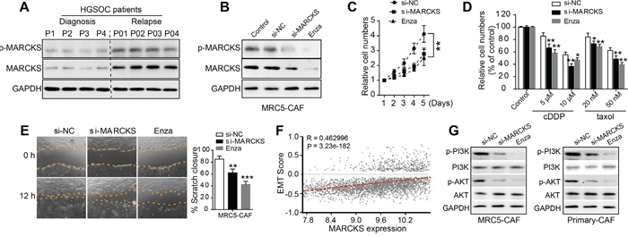 Figure 3: MARCKS is involved in CAF proliferation, chemotherapeutical resistance and migration. A. Western blot analysis of MARCKS and p-MARCKS in purified CAFs from EOC tumor tissues obtained either at initial diagnosis or at disease recurrence after several cycles of chemotherapeutical intervention. B. Immunoblotting of MARCKS and p-MARCKS protein expression in MRC5-CAF cells in the absence or presence of si-NC or si-MARCKS or enzastaurin (Enza, 1 μM) treatment for 48 h. C. CCK8 assay detecting relative cell numbers of MRC5-CAFs in the si-NC or si-MARCKS or Enza (1 μM) intervention groups for various duration (1-5 days). D. Detection of relative cell viability in the si-NC or si-MARCKS or Enza (1 μM) pretreated groups of MRC5-CAFs, in the absence or presence of cDDP or taxol intervention at various dosage for 48 h. E. Representative images demonstrating and statistical analysis of wound closure capacity of MRC5-CAFs in si-NC or si-MARCKS or Enza (1 μM) treatment groups at 0 h and 12 h time points. F. Spearman correlation analysis of MARCKS expression with that of normalized EMT score in integrated large cohorts of ovarian cancer [38]. G. Western blot analysis of PI3K, p-PI3K, AKT and p-AKT expression in MRC5-CAFs and primary ovarian CAFs, in the presence of si-NC or si-MARCKS or Enza (1 μM) treatment for 72 h. GAPDH served as the loading control. Data are expressed as mean ± s.e.m. (*P < 0.05; **P < 0.01).