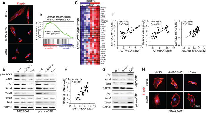 Figure 5: Twist1 is involved in the regulation of MARCKS on CAF activity. A. Representative images of F-actin staining in MRC5-CAF cells after treatment with si-NC or si-MARCKS or Enza (1 μM) for 72 h. B. “ACTIN_CYTOSKELETON” GSEA plot of enrichment of gene expression in the genesets positively correlated with MARCKS expression in ovarian stromal profiles of GSE40595 dataset. C. Heat map of the top 30 genes included in the “ACTIN_CYTOSKELETON” signature expressed in the top 5 and the bottom 5 ovarian stroma samples ranked by MARCKS expression levels of GSE40595. Blue and red in the heatmap indicate genes expression that were relatively low or high, respectively. D. Pearson correlation analysis of CAF features markers as FAP, Thy1 and PDGFRA with that of MARCKS expression in 39 microdissected ovarian stromal profiles of GSE40595 dataset. E. Western blot analysis of p-MARCKS, p-AKT, FAP, Acta2, Twist1, Snai1 and Zeb1 in MRC5-CAFs and primary ovarian CAFs after 72 h treatment with si-NC or si-MARCKS or Enza (1 μM). GAPDH served as the loading control. F. Pearson correlation analysis of Twist1 with that of MARCKS in 39 microdissected ovarian stromal profiles of GSE40595 dataset. G. Western blot analysis of FAP, Acta2 and Twist1 in MRC5-CAFs and primary ovarian CAFs after 72 h treatment with si-Twist1 or Twist1 expressing plasmid. H. Representative images of cellular cytoskeleton by F-actin staining of MRC5-CAF cells in the treatment group of si-NC or si-MARCKS or Enza (1 μM), in the absence or presence of Twist1 expressing plasmid.