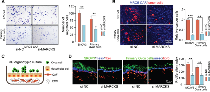 Figure 6: Inhibition of MARCKS attenuates the supportive role of CAFs to tumor cells. A. Representative images and statistical analysis of cellular migration of SKOV3 and primary ovarian cancer cells, in coculture invasion system with MRC5-CAFs transfected with si-NC or si-MARCKS. B. Representative fluorescent images and statistical analysis of the relative cell numbers of PKH-26 (red) labeled SKOV3 and primary ovarian cancer cells, after 72 h contact coculture on top of the CMAC (blue) labeled MRC5-CAFs transfected with si-NC or si-MARCKS. C. Schematic depicting of the 3D organotypic culture assay with matrigel ECM substrate, fluorescently labeled CAFs (red, PKH-26), HMrSV5 mesothelial cells (blue, CMAC) and tumor cells (green, PKH-67) from bottom to the top layer. D. Representative fluorescent images and quantification of the proliferation index of PKH-67 labeled SKOV3 and primary ovarian cancer cells, in co-culture model as described above with variant MRC5-CAFs transfected with si-NC or si-MARCKS. Data are expressed as mean ± s.e.m. of at least three independent experiments. (**P<0.01; ***P<0.001).