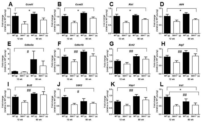 Figure 1: Gene expression levels of candidate genes within bone marrow derived c-Kit+ cells linked to HSC aging and function in young and aged WT and S6K1-/- mice. Graphs show a significant genotype A.-D., age E.-K. or both a significant genotype and an age effect L.. A significant interaction between genotype and age was observed for both S6K2 J. and Irs1 L.. Graphs display mean (±SEM) fold-change, all relative to the young WT group (female mice, n = 3-5; genotype effects * P < 0.05, age effects # P < 0.05, ## P < 0.01), with closed bars indicating WT mice and open bars indicating S6K1-/- mice. See also Tables S1 and S2.
