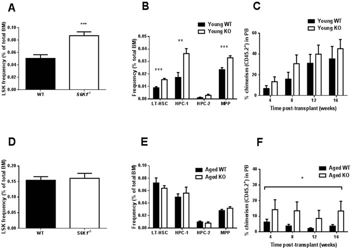 Figure 2: HSC frequency and function in young and aged WT and S6K1-/- mice. A. LSK frequency (percentage of total BM), B. frequency (percentage of total BM) of LT-HSC, HPC-1, HPC-2 and MPP in young WT and S6K1-/- mice (n = 9-11, mixed gender). C. Percentage of chimerism (CD45.2+ cells) in peripheral blood (PB) from irradiated recipients transplanted with young WT or S6K1-/- LT-HSCs (donor cells female, recipients mixed gender, n = 6-9). The effect of genotype on chimerism was non-significant (F = 3.037, P = 0.088), although the effect of time was (F = 5.696, P = 0.002). D. LSK frequency and E. frequency of LT-HSC, HPC-1, HPC-2 and MPP in BM of aged WT and S6K1-/- mice (n = 7-15, mixed gender). F. Percentage of chimerism (CD45.2+ cells) in PB from irradiated recipients transplanted with aged WT or S6K1-/- LT-HSCs (donor cells female, recipients mixed gender, n = 6). A highly significant genotype effect was detected (F = 8.452, P = 0.006), but the effect of time was non-significant (F = 0.494, P = 0.688). (* P < 0.05, ** P < 0.01, *** P < 0.001). Values are mean±SEM, with closed bars indicating WT mice and open bars indicating S6K1-/- mice.