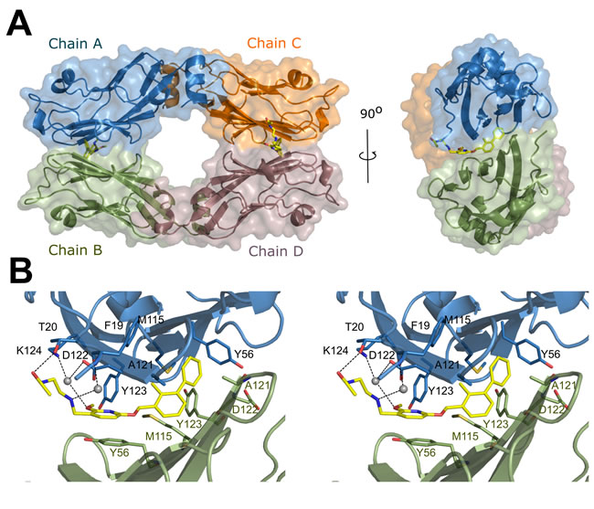 Figure 2: Crystal structure of BMS-202/PD-L1 complex. A. Within the asymmetric unit four molecules of PD-L1 (mixed ribbon/surface representation) are organized into two dimers (green and blue, and orange and brown). Each dimer binds a single molecule of BMS-202 (yellow) at the dimer interface. B. Detailed interactions of BMS-202 at the binding cleft of PD-L1 dimer (stereoview). BMS-202 binds at a hydrophobic cavity formed upon PD-L1 dimerization. Color coding as in panel a. Water molecules are represented by grey spheres. Hydrogen bonds are shown as black dotted lines.