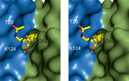 Figure 3: BMS-202 binds inside a cylindrical cleft at PD-L1 dimer interface. Hydrophobic pocket accommodating the inhibitor and formed at PD-L1 dimer interface is shown from the solvent accessible side (stereoview). N-(2-aminoethyl)acetamide moiety of the inhibitor is visible. The PD-L1 molecules forming the dimer are colored blue and green for chain A and B, respectively.