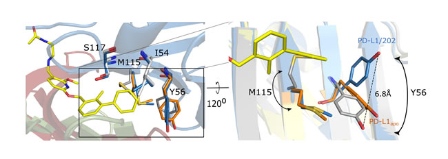 Figure 5: Conformational changes upon PD-L1 interaction with BMS-202. Overlay of apo-PD-L1 (orange; PDB 5C3T) and PD-L1 structures derived from PD-L1/PD-1 complex (gray; PDB 4ZQK) and PD-L1/BMS-202 complex (blue - chain A) demonstrates significant rearrangement of Tyr56 sidechain disposition upon BMS-202 binding compared to much less pronounced changes observed upon PD-1 binding (Note the T-stacking interaction of Tyr56 with the distal phenyl moiety of the inhibitor. Similar for BMS-8 containing structure (not shown). The rearrangement of Met115 sidechain is in turn more pronounced upon PD-1 binding compared to BMS-202 binding. Chain B of the PD-L1/BMS-202 dimer (green). PD-1 (red).