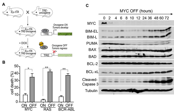 Figure 1: Apoptosis induction upon oncogene inactivation in Tet-regulated mouse ALL models. A. The ALL mouse models controlled by the Tet-off system. In the absence of doxycycline (DOX), tTA binds to TRE to drive the overexpression of the oncogenes. In the presence of DOX, tTA cannot bind and oncogene expression is off. B. Inactivation of the oncogenes induced massive apoptosis of tumor cells according to 7-AAD staining. Oncogene expression was shutoff for three days in the MYC and RAS models and for one day in the BCR-ABL model. Each time point includes three replicates. Data are presented as mean +/- SEM. Student’s t test. *p < 0.01, **p < 0.001. C. Expression of BCL-2 family proteins and caspase 3 cleavage upon the inactivation of MYC. Protein samples were collected every two hours for the first 12 hours and then every 12 hours.