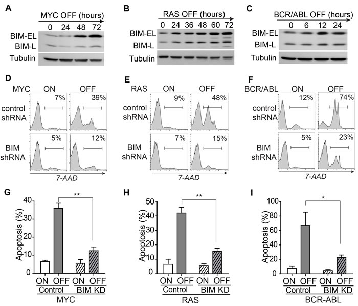 Figure 2: BIM mediates apoptosis induced by inactivation of the driver oncogene. A.-C. The gradual induction of Bim protein expression upon the inactivation of the MYC, RAS, and BCR-ABL. Both BIM-EL and BIM-L isoforms are shown. The level of tubulin served as loading control. D.-F. Knockdown of BIM expression blocks the induction of apoptosis by oncogene inactivation. Oncogene expression was shutoff for three days in the MYC and RAS models and for two days in the BCR-ABL model. The gates for 7-AAD positive populations are set as indicated. Apoptosis rates are labeled in the top right corners of the plots. For each cell line, only one representative plot is shown. Data for the replicates was further quantified and presented in figure G-I. G.-I. Quantification of the apoptosis rates in control versus tumor cells with BIM knockdown. Each time point includes three replicates. Data are presented as mean +/- SEM. Student’s t test. Data are presented as mean +/- SEM. Student’s t test. *p < 0.05, **p < 0.001.