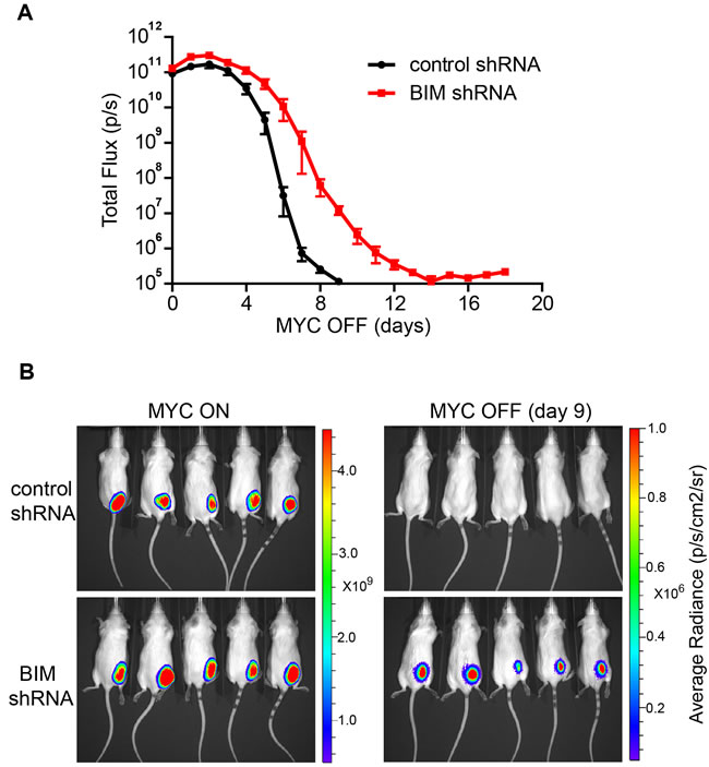 Figure 3: Suppression of BIM expression delays in vivo tumor regression upon oncogene inactivation. A. Kinetics of tumor regression in control versus BIM knockdown tumors. The total flux of bioluminescence signal was used to measure the tumor mass. Five mice per group were imaged immediately before doxycycline treatment and then daily after doxycycline treatment for 18 days. The data at each time point were presented and plotted as mean +/- SEM. The kinetics of tumor regression between control and Bim shRNA group is significantly different (p < 0.05. two-way ANOVA with Bonferroni post-test). B. Tumor mass shown by bioluminescence imagining. Both MYC ON tumors and MYC OFF (day 9) tumors are shown. The colored scale bar indicates the range of the average radiance (p/s/cm2/sr) of the tumor area.