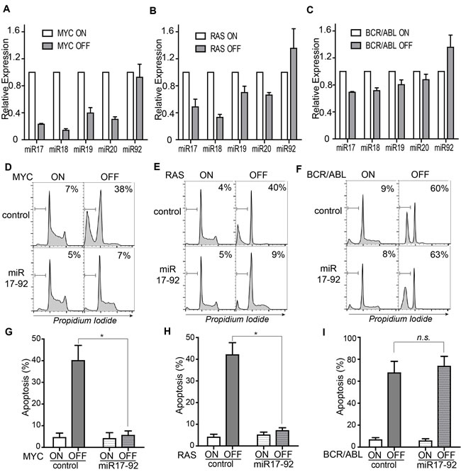 Figure 4: The microRNA cluster, miR-17-92, regulates apoptosis in MYC-, RAS- but not BCR-ABL-driven ALL model. A.-C. Expression of individual microRNAs in the miR-17-92 cluster upon inactivation of the driver oncogenes. The expression levels of each microRNA were quantified using real-time PCR and normalized to expression level of endogenous U6 snRNA. D.-F. Apoptosis induction and cell cycle distribution in the control and miR-17-92 expressing tumor cells. Cell cycle distribution was assessed by flow cytometric analysis of propidium iodide-stained cells. Apoptosis was quantified by gating on the sub-G1 populations. Oncogene expression was shut off for three days in the MYC and RAS models and for two days in the BCR-ABL model. The gates for sub-G1 populations are set as indicated. The relative percentage of apoptotic populations is labeled in the top right corner of the plots. For each cell line, only one representative plot is shown. Data for the replicates was further quantified and presented in figure G-I. G.-I. Quantification of sub-G1 populations in the control and miR-17-92 expressing tumor cells. Each time point includes at least three replicates. Data are presented as mean +/- SEM. Student’s t test. *p < 0.001. n.s. stands for Not Statistically Significant.