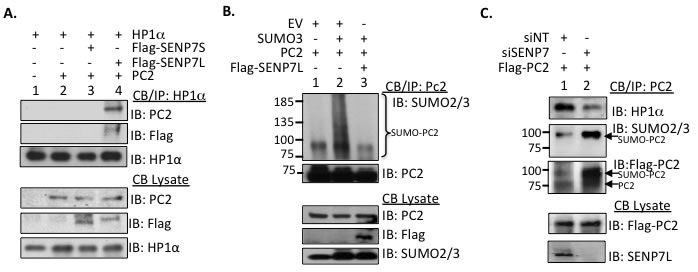 Figure 2: SENP7L regulates PC2-HP1α interaction and PC2 SUMOylation. A. PC2, HP1α, and SENP7L interact at the chromatin. Chromatin-bound HP1α was isolated from MCF7 cells and interaction with PC2 and/or select SENP7 isoforms was evaluated with Western Blot analysis. B. SENP7L deSUMOylates PC2. In in vivo SUMOylation studies, modification of isolated chromatin-bound PC2 is identified with SUMO2/3 antibody in the presence and absence of SENP7L. C. SENP7L dictates PC2’s SUMOylation and binding to HP1α. MCF7 cells were treated with the appropriate siRNA for 48hr and subsequently the modification state of the chromatin-bound PC2 was established as described above.