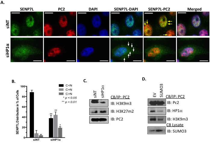 Figure 3: HP1α directs the localization of PC2 and SENP7L. A.-B. HP1α loss alters SENP7L subcellular localization. Cells were incubated with either non-targeting (siNT) or HP1α-specific (siHP1α) siRNA for 48 hr. Immunofluorescence was performed with SENP7L and PC2 antibodies and nuclei stained with DAPI. Total cells and SENP7L distribution was evaluated in randomly selected 20x magnification fields (siNT: n = 3 and siHP1α: n = 7); percent of cells with cytosolic (C) versus nuclear (N) SENP7L were analyzed using ANOVA and Tukey’s post-hoc. C. PC2’s enrichment at H3K9m3 requires HP1α. Chromatin-bound PC2 was isolated from MCF7 cells treated with either siNT or siHP1 as described above. Western blot analysis was performed to evaluate PC2’s association with modified histones tails, specifically H3K9m3 and H3K27m3. D. HyperSUMO conditions reduce PC2’s association with both H3K9m3 and HP1α. MCF7 cells were exposed to elevated SUMO3 levels for 24 hr and binding partners of endogenous PC2 was evaluated using the immunoprecipitation/ immunoblot techniques.