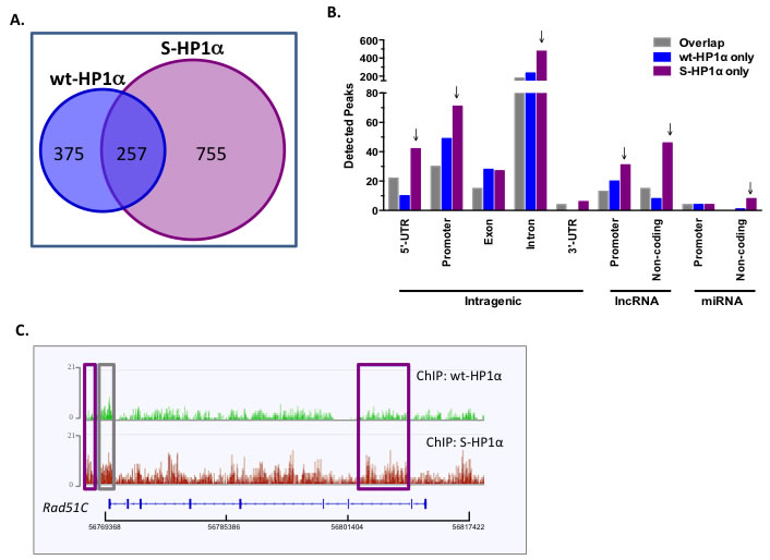 Figure 4: HP1α SUMOylation alters its chromatin binding profile. A. Venn diagram of the total binding loci of wild-type and SUMO3-fused HP1α (wt- and S-HP1α) as identified by ChIP-Seq analysis. B. S-HP1α binds more 5’-UTR, promoters, and introns in intragenic regions and regions transcribing ncRNA. Graph represents distribution of detected peaks (binding sites) of wt and S-HP1α at indicated intragenic region. Gray bars indicate binding sites shared by both HP1α types (Overlap) while binding sites unique to wt-HP1α or S-HP1α only are labeled appropriately. Arrows highlight chromosomal regions with a difference between binding profiles of S-HP1α and wt-HP1α. C. ChIP-Seq track at the Rad51C loci that highlights the number and position of the binding sites for wt- and S-HP1α. Purple box indicates a unique S-HP1α binding site while gray box is common to both wt and S-HP1α.
