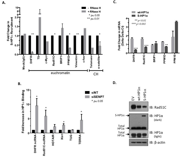 Figure 5: ncRNA-mediated recruitment of SUMOylated HP1α to DDR-regulating gene loci. A. RNA/DNA complex required for the recruitment of HP1α to select chromatin loci. MCF7 cells were treated with RNase H to disrupt RNA-DNA interaction prior to ChIP of the S-HP1α protein. Real-time PCR was performed to identify S-HP1α recruitment to specific chromatin loci; CH represents constitutive heterochromatin sites. Student’s t-test on raw CT data was used to evaluate for statistical significance with p-values < 0.05 indicated with an asterisk. B. HP1α associates with lncRNA in the absence of SENP7L. Following either non-targeting or SENP7-specific siRNA treatment for 48 hr, chromatin-bound RNA that associates with HP1α was isolated via chromatin-RNA immunoprecipitation assay (Ch-RIP). Primers for select ncRNA were used to detect the immunoprecipitated RNA from each treatment group. Bar graph indicates the mean ± SEM of three independent Ch-RIP experiments. C. SUMOylated HP1α reduces select DDR gene transcripts. An empty vector, wild-type HP1α (wt-HP1α), or SUMO3-fused HP1α (S-HP1α) plasmid was overexpressed in MCF7 cells and RNA was isolated. Subsequently real-time PCR analysis was conducted with the appropriate primers. The graph represents mRNA levels of either wt-HP1α or S-HP1α treated cells normalized to levels in cells with empty vector; Student’s t-test indicated significance. D. SUMOylated HP1α reduces Rad51C protein. Cells expressing either empty vector (EV), wild-type HP1α, or S-HP1α were lysed and subject to SDS-PAGE to evaluate Rad51C levels. Total HP1α represents both endogenous and exogenous HP1α. Blots are representative of 2 independent experiments.