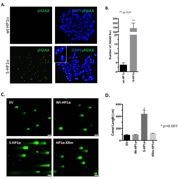 Since the Rad51 family is a major mediator of the DDR, we postulated that S-HP1α would impair the DDR and support the accumulation of double-strand breaks (DSB) in BCa cells. MCF7 cells were assessed for γ-H2AX foci, a mark for DSB. Chromatin from cells with wt-HP1α did not exhibit incorporation of the phosphorylated H2AX variant (Figure 6A). In contrast, transfection of the S-HP1α significantly increases γ-H2AX foci on chromatin (Figure 6A and 6B). Similar results were obtained with a comet assay; specifically, elevation of S-HP1α, but not wt-HP1α, causes DNA breaks (Figure 6C and 6D). In contrast, overexpression of an HP1α mutant that is SUMO deficient (HP1α-KRm, [5]) does not damage DNA (Figure 6C and 6D). Hence, the data supports that S-HP1α reduces the ability of the cell to resolve the damaged DNA.