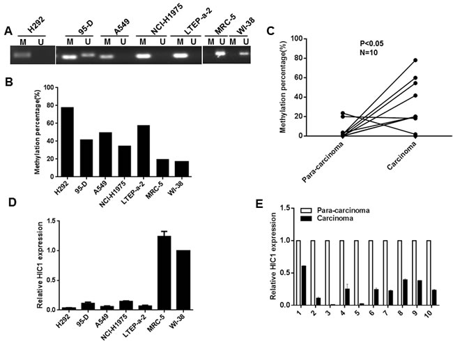 Figure 1: Methylation of HIC1 promoter impairs its expression in NSCLC. A. Genomic DNAs from NSCLC cell lines were treated with sodium bisulfate, the PCR products amplificated with HIC1 MSP primers were confirmed by agarose gel electrophoresis. M: methylation; U: unmethylation. B. and C. Genomic DNAs from NSCLC cell lines and tissues were treated with sodium bisulfate, PCR products amplificated with HIC1 BSP primers were sequenced and the percentage of methylation was calculated. D. and E. Quantitative real-time RCR analysis of HIC1 gene in NSCLC cell lines and tissues.