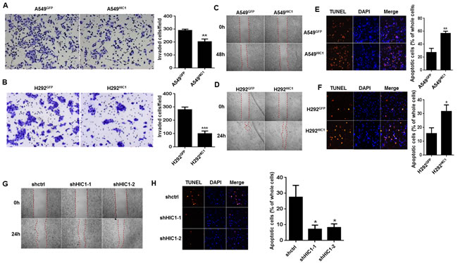 Figure 2: HIC1 inhibits invasion, migration and promotes apoptosis of NSCLC cells. A. and B. The invasive properties of A549 and H292 cells expressing control vector or HIC1 were detected through extracellular matrices in porous culture chambers, the invasive cells were stained by crystal violet and then photographed by fluorescence inversion microscope system. C. and D. The migration abilities of A549 and H292 expressing control vector or HIC1 were detected by scratch wound healing assay. E. and F. A549 and H292 cells expressing control vector or HIC1 were treated with 0.1 μmol/L of staurosporine for 12 h, and apoptosis was performed by tunel assay using the In Situ Cell Death Detection Kit, TMR red (Roche). G. HIC1 knockdown by shHIC1-1 and shHIC1-2 in A549 cells promoted migration, H. inhibited apoptosis. The experiments were performed 3 times; representative images were shown (× 100). Data are represented as mean ± SD. *p < 0.05, **p < 0.01, ***p < 0.001.