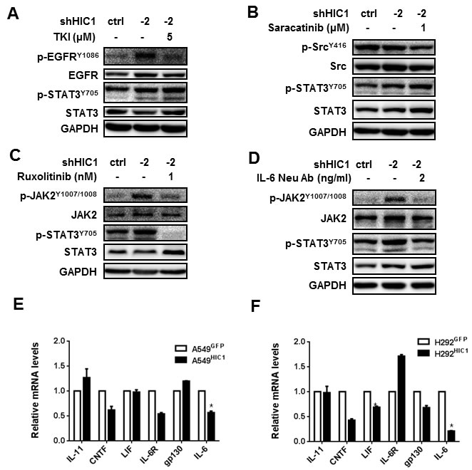 Figure 4: HIC1 inactivates the activity of STAT3 through targeting IL-6/JAK pathway. A549 cells with HIC1 knockdown were treated with multiple signaling pathways inhibitors for 6 hours. The activities of these pathways were detected by Western blot, A. 5μM TKI reduced the levels of p-EGFRY1086, but had no effect on p-STAT3Y705. B. 1μM Saracatinib reduced the levels of p-SRCY416, but had no effect on p-STAT3Y705. C. and D. 1 nM Ruxolitinib and 2 ng/ml IL-6 Neu Ab reduced the levels of both p-JAK2Y1007/1008 and p-STAT3Y705. E. and F. Quantitative real-time PCR assayed the expression of IL-6 family factors such as IL-11, CNTF, LIF, IL-6 and the receptors IL-6R and gp130 in A549 HIC1 and H292HIC1 cells and their controls. Three independent experiments were performed. Data are represented as mean ± SD.*p < 0.05.
