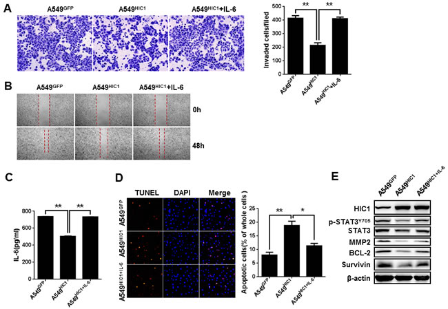 Figure 5: IL-6 partially rescues HIC1-induced phenotypes of NSCLC cells. A. and B. Exogenous IL-6(40 ng/ml) stimulation in A549 cells could partially rescued the reducing invasion and migration caused by HIC1 re-expression. C. ELISAs determined the expression of IL-6 in A549GFP, A549HIC1and A549HIC1+IL-6 cells. D. Re-expression of IL-6 in A549HIC1 cells partially rescued HIC1-induced enhancement of apoptosis. Representative images were shown (× 100). E. p-STAT3Y705, MMP2, Bcl-2 and Survivin levels were detected in A549GFP, A549HIC1 and A549HIC1+IL-6 cells by Western blot. Three independent experiments were performed. Data are represented as mean ± SD. *p < 0.05, **p < 0.01.