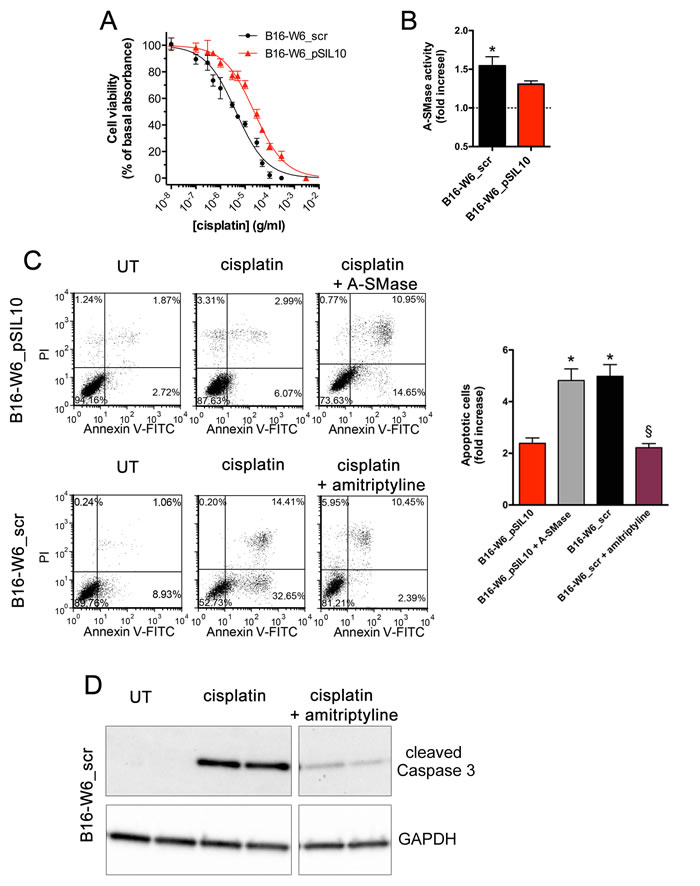 Figure 2: Chemo-resistance to cisplatin in vitro is inversely proportional to A-SMase levels. A. Dose-response curves of the effects of cisplatin on the viability of B16-W6_scr and B1-W6_pSIL10, as measured by the MTT assay (n = 10). B. Measurement of A-SMase activity in B16-W6_scr and B1-W6_pSIL10 cells treated with cisplatin (10 μg/ml, 16 h). Activity was expressed as fold increase of untreated cells (n = 5). Statistical significance *p < 0.05 vs untreated B16-W6_scr. C. B1-W6_pSIL10 and B16-W6_scr were cultured for 16 h in the absence (UT: untreated) or in the presence of cisplatin (10 μg/ml). B1-W6_pSIL10 and B16-W6_scr were also treated with human A-SMase (2.0 units/ml) or amitriptyline (5 µM, 1 h before cisplatin treatment), respectively. Left panels: representative dot plots of Annexin V-FITC/PI staining; Right panel: apoptosis quantification expressed as fold increase of total apoptotic cells (Annexin V+/PI− and Annexin V+/PI+ cells) compared to their respective UT controls (n = 8). Statistical significance *and § p < 0.05 vs B1-W6_pSIL10 and B16-W6_scr, respectively. D. Western blot analysis of cleaved Caspase 3 expression in B16-W6_scr cells cultured for 16 h in the absence (UT) or in the presence of cisplatin (10 μg/ml) and cisplatin + amitriptyline (5 µM, 1 h before cisplatin treatment). GAPDH was used as the internal standard. The images are representative of results obtained from three experiments.