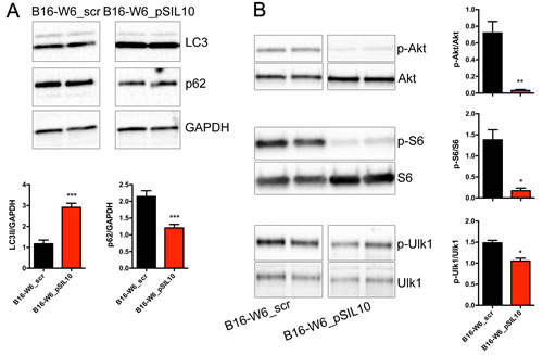 Autophagy contributes to the anticancer efficacy of chemotherapy in different types of cancer, including melanoma [18-22]. We investigated the relationship of A-SMase and autophagy in our model; autophagy was assessed by measuring LC3 and p62 protein levels by western blot experiments. LC3 is recruited from the cytosol and associates with the phagophore early in autophagy, while p62 is a cargo of ubiquitinated proteins that is degraded lately during the autophagic process and accumulates in the presence of defective autophagy [14, 16, 17]. As shown in Figure 3A, formation of lipidated LC3 (the faster migrating band is indicative of completed autophagosomes) and reduction of p62 levels was higher in B16-W6_pSIL10 than in B16-W6_scr. Autophagy is inhibited by mTOR a protein activated by Akt. mTOR increases (directly and indirectly) the phosphorylation of autophagy controlling proteins including the S6 ribosomal protein (S6) [14, 16, 17, 44] and Ulk1 [45]. We found that phosphorylated levels of Akt in B16-W6_pSIL10 were significantly lower than B16-W6_scr cells and accompanied by a lower phosphorylation levels of S6 and Ulk1 (Figure 3B).