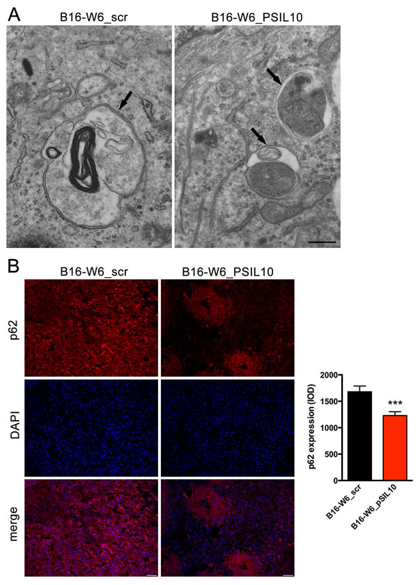 Figure 4: A-SMase levels affect autophagic process in vivo. C57BL/6 mice were injected in the right flank with B16-W6_scr and B16-W6_pSIL10 cells; tumours were then resected when they reached the volume of 500 mm3. A. Transmission electron microscopy showing autophagosomes (black arrows) in B16-W6_scr and B16-W6_pSIL10 tumours. At the lower right of the B16-W6_pSIL10 micrograph a site of close vicinity between the membranes of endoplasmic reticulum and mitochondrion, i.e. MAM, can be seen. The images are representative of results obtained from three experiments. Scale bar = 0.5 µm. B. Left panels: representative fluorescence micrographs of p62 and DAPI staining in B16-W6_scr and B16-W6_pSIL10 tumours. Scale bar = 50 µm; Right panel: quantification of p62 immunofluorescence staining (n = 3). Values are expressed as integrated optical density (IOD). Statistical significance ***p < 0.001 vs B16-W6_scr.