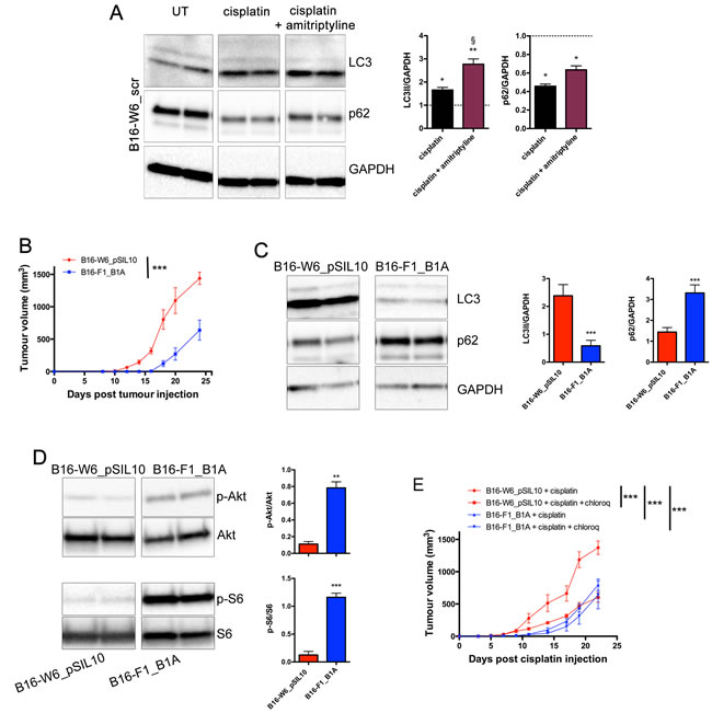 Figure 5: A-SMase levels, authophagy, and chemo-resistance to cisplatin. A. Left panels: representative western blot analysis of LC3 lipidation and p62 expression in B1-W6_scr cells cultured for 16 h in the absence (UT: untreated) or in the presence of cisplatin (10 μg/ml) and cisplatin + amitriptyline (5 µM, 1 h before cisplatin treatment). GAPDH was used as the internal standard; Right panels: densitometric analysis of lipidated LC3 (LC3 II) and p62 expression measured as fold change compared to their respective UT controls (n = 3). Statistical significance *p < 0.05 and **p < 0.01 vs UT; § p < 0.05 vs B1-W6_scr + cisplatin. B. C57BL/6 mice (n = 7) were injected in the right flank with B16-W6_pSIL10 and B16-F1_B1A cells. Tumour growth was monitored by measuring tumour volume (mm3) every 2-3 days. Statistical significance ***p < 0.001. C. Left panels: representative western blot analysis of LC3 lipidation and p62 expression in B1-W6_pSIL10 and B16-F1_B1A cells. GAPDH was used as the internal standard; Right panels: densitometric analysis of lipidated LC3 (LC3 II) and p62 expression (n = 7). D. Left panels: representative western blot analysis of phosphorylated Akt and S6 in B1-W6_pSIL10 and B16-F1_B1A cells. The total Akt and S6 were used as internal standard; Right panels: densitometric analysis of phosphorylation levels of Akt and S6 (n = 5-7). Statistical significance *p < 0.05, **p < 0.01, and ***p < 0.001 vs B16-W6_ pSIL10. E. B1-W6_pSIL10 and B16-F1_B1A allografts were established as in A (n = 7). When tumours where palpable cisplatin alone (4 mg/kg, intraperitoneally) and cisplatin + chloroquine (30 mM, in the peritumoural area) were injected and tumour growth monitored. Statistical significance ***p < 0.001.