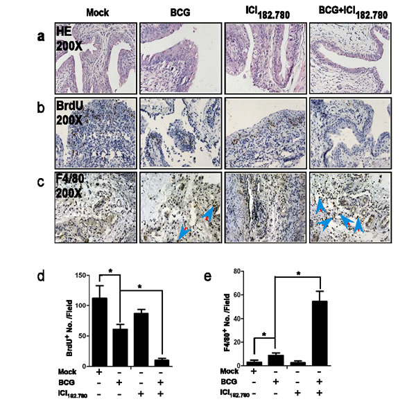 Figure 4: ICI 182,780 (ICI) potentiates the anti-tumor effects of BCG in the BBN-induced mouse BCa model. Twelve weeks old FVB female mice were divided into 4 groups (10 mice per group) and treated with 0.05% BBN in drinking water for 12 weeks. Groups (1-4) mice were then injected with 1) mock control, 2) BCG alone (2×106CFU/mouse, intravesical injection weekly), 3) ICI alone (0.1 mg/mouse, i.p. injected every other day,) and 4) BCG (2×106CFU/mouse, intravesical injection weekly) plus ICI (0.1 mg/mouse, i.p. injected every other day). day). At 24 hr after the last treatment, mice were injected with BrdU. At 24 hr after the BrdU injection, mice were then sacrificed and bladders were collected for further examination. a. H&E staining. b. BrdU Immunohistostaining for BCa cells proliferation. c. We used monocyte/macrophage marker (F4/80) antibody to assay monocyte/macrophage cell infiltration. d. and e. Quantitation shows the positively stained cell numbers per field of BrdU and F4/80, respectively. Significance was defined as *p < 0.05 by student t test.