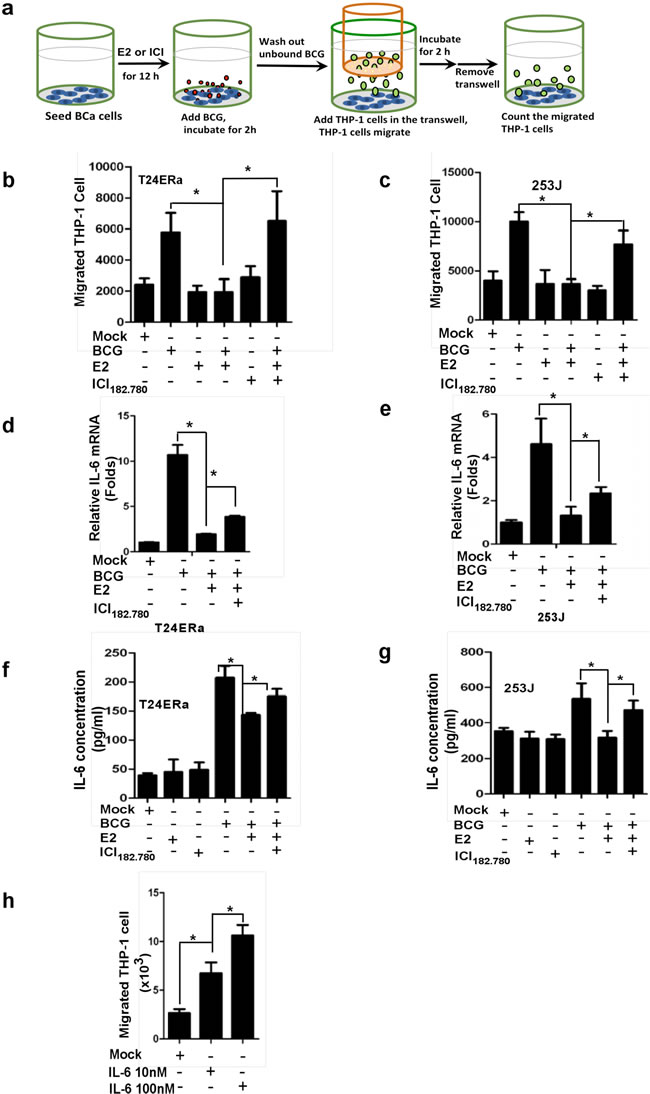 Figure 2: ICI 182,780 (ICI) promotes monocyte/macrophage migration toward BCG-treated BCa cells. a. 5x104 BCa cells were seeded into the bottom chambers of transwells. cells were treated with 1 µM ICI and/or 10nM E2 for 12h and BCG was added and incubated for an additional 2 h. After washing out unattached BCG, inserts were added and 4x105 THP-1 cells were added into the upper well and then co-incubated with BCa cells for 2 h. The media from the bottom well were collected to count the migrated THP1 cells. b. and c. THP-1 cell migration toward T24 ERα or 253J cells. Each experiment was performed in triplicate. d.-g. E2 decreased BCG binding and internalization to BCa, led to reduce IL-6 production, and ICI can reverse E2 mediated inhibition. We seeded 4x105 T24 ERα or 253J cells into the plate. Cells were treated with 1 μM ICI in the presence of 1 nM E2 for 12 h, and then incubated with BCG (2×107 CFU) for 2 h. After washing away unbound BCG, mRNA was extracted from BCa cells to determine IL-6 expression using Q-PCR. h. ICI promotes THP-1 migration through regulating IL-6 level in BCa cells. CMs were collected from BCa cells treated with ICI or E2 and BCG as indicated in the figure design. The 10 nM or 100 nM recombinant human IL6 (rhIL-6) was added into the bottom wells, 4×105 THP-1 cells were added into the upper wells, and co-cultured for 2 h. The media from the bottom wells was collected to count the migrated THP1 cells. Each experiment was performed in triplicate. *indicates p<0.05.