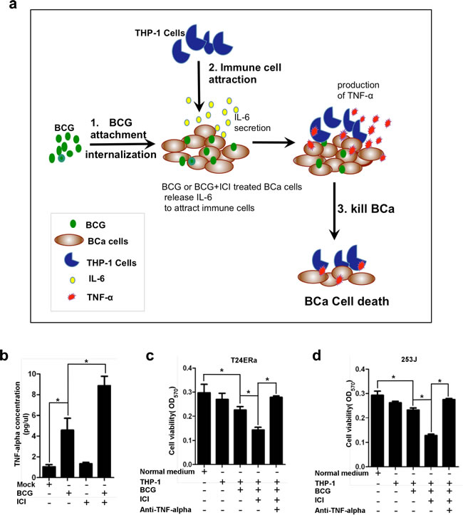 Figure 3: Monocytes/macrophages recruitment to BCa under the BCG plus ICI treatment can more effectively inhibit the BCa cell growth. a. The schematic mechanism presentation of monocytes/macrophage recruitment induced by BCG or by BCG plus ICI. The increased immune cell infiltration resulted in a higher efficacy to suppress BCa cells. b. We co-cultured BCa cells with TPH-1 cells, then treated them with BCG, or BCG plus ICI in normal media for 48 hr. We then collected the conditioned media for detecting TNF-α protein level by ELISA assay. c. and d. 1x 106 THP-1 cells were cultured in 6 well plates, treated with BCG only, BCG+ICI, PBS only, or ICI only. CMs from these 4 different treatment groups were collected to treat BCa cells for 72 h. The T24ERα (c) and 253J (d) cell viability were detected by MTT assay. * indicates p<0.05.