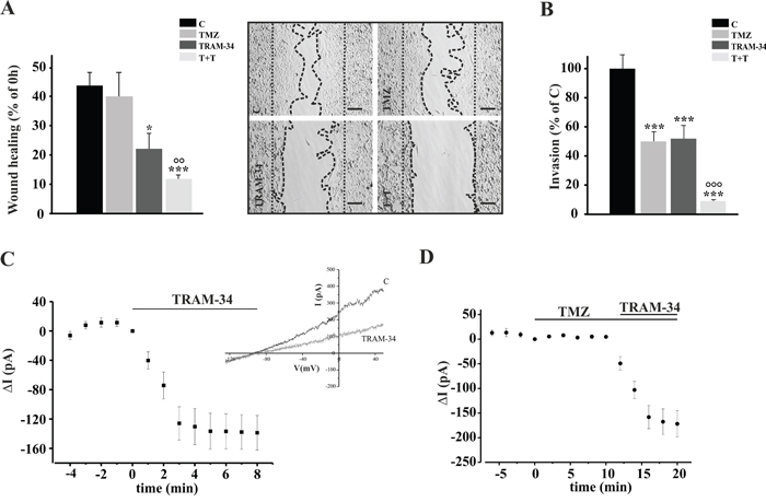 Figure 1: TRAM-34/TMZ treatment reduces basal cell migration and invasion of GL261 cells. A. GL261 cells were treated with vehicle (control, C), TMZ, TRAM-34 or both (T+T) for 48 h and assayed for migration. The wound healing was analyzed using ImageJ software and data are expressed as [1- (empty area at 48 h/ empty area at 0 h)] x100, where the empty area at 0 h is indicated by the dotted parallel lines and the empty area at 48 h is comprised between the dotted curved lines. *p<0.05; ***p<0.001 vs C; °° p<0.01 vs TMZ n=4, One-Way ANOVA, Student-Newman-Keuls post-test. Representative picture of wound healing assay is shown on the right (4X magnification, bar = 100 μm). B. GL261 cells were treated as in A and plated on Matrigel film for 48 h; ***p<0.001 vs C; °°° p<0.001 vs TMZ n=4, One-Way ANOVA, Student-Newman-Keuls post-test. C. Time course of the effect of TRAM-34 (2.5 μM) on current evoked in GL261 cells (n= 12) by repeated voltage ramps (from -130 mV to + 50 mV, holding potential -70 mV). Acute application of TRAM-34 revealed the functional expression of KCa3.1 channels. Typical current trace in response to repeated ramps is shown in the inset. D. Time course of the effect of TMZ (30 μM) application alone and in co-application with TRAM-34 (2.5 μM) on current evoked in GL261 cells (n= 7) by repeated voltage ramps.