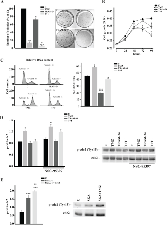 Figure 2: TRAM-34/TMZ treatment reduces clonogenicity and growth of GL261 cells and alters cell cycle. A. GL261 cells were treated with vehicle (control, C), TMZ, TRAM-34 or both (T+T) for 24 h. Colonies grown were counted at 14 days. Data are expressed as % of C, *p<0.05, **p<0.01 and ***p<0.001 vs C; ° p<0.05 vs TMZ n=4 by One-Way ANOVA, Student-Newman-Keuls post-test. Right, representative picture of a colony forming assay. B. Growth curve of GL261 cells treated as in A for the indicated time points. The results are expressed as function of the optical density (OD) at 590 nm.*p<0.05vs C; ° p<0.05 vs TMZ n=3, One-Way ANOVA, Student-Newman-Keuls post-test. C. GL261 cells were treated as in A for 72 h and cell cycle analysis was performed by flow cytometry. Representative experiment on the left shows % cells in different phases of the cell cycle. The mean percentage of cells in G2/M phase with the different treatments is shown on the right. *p<0.05 and ***p<0.001 vs C; ° p<0.05 and °°° p<0.001 vs TMZ n=3 by One-Way ANOVA, Student-Newman-Keuls post-test. D. GL261 cells were treated as in A in absence or presence of NSC-95397(60 nM) for 48 h, lysed and analyzed by Western Blot for cdc2 phosphorylation. Data are shown as p-cdc2/cdc2 ratio; *p <0.05vs C n = 4, One-Way ANOVA, Student-Newman-Keuls post-test. Right, representative blot. E. GL261 cells were treated with vehicle (control, C), SKA-31 (250 nM) or SKA-31 + TMZ (30 μM) for 48 h, lysed and analyzed by Western Blot for cdc2 phosphorylation. Data are shown as p-cdc2/cdc2 ratio; ***p <0,001 vs C n = 4,°° p <0,01 vs SKA-31. One-Way ANOVA, Student-Newman-Keuls post-test. Right, representative blot.