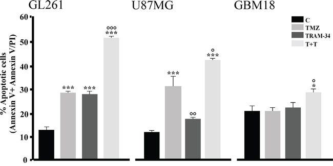 Figure 3: TMZ/TRAM-34 treatment increases apoptosis in murine and human malignant glioma cells. GL261, U87MG and GBM18 cells were treated with vehicle (control, C), TMZ, TRAM-34 or both (T+T) for 96 h. Cell apoptosis was detected by flow cytometry; data represent the mean value of Annexin V positive plus Annexin V/PI positive cells expressed as percentage of total cells. *p<0.05 and ***p<0.001 vs C; ° p<0.05, °° p<0.01 and °°° p<0.001 vs TMZ n=3 by One-Way ANOVA, Student-Newman-Keuls post-test.