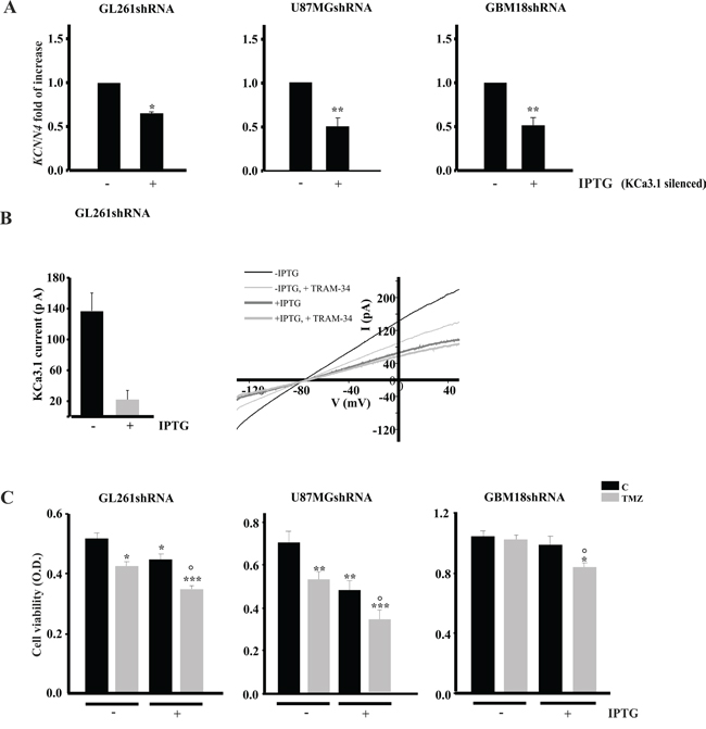 Figure 4: KCa3.1 silencing and TMZ treatment reduce glioma cell viability. A. GL261, U87MG and GBM18 cells were infected with IPTG-inducible shRNA construct to silence KCa3.1 channel (GL261shRNA, U87MGshRNA and GBM18shRNA). Cells were induced (+IPTG) or not (-IPTG) and assayed for the expression of channel mRNA (KCNN4) by RT-PCR. Data are expressed as fold increase vs -IPTG. *p<0.05 and **p<0.01 vs –IPTG. n=4 by One-Way ANOVA, Student-Newman-Keuls post-test. B. Bar chart showing average KCa3.1 current amplitude, obtained as TRAM-34 (2.5 μM) sensitive current, in GL261shRNA cells without (n=7) and with IPTG induction (n=8), by repeated voltage ramps (from -130 mV to + 50 mV, holding potential -70 mV). Right, typical current trace in response to repeated ramps in control (black trace) and in induced GL261shRNA (grey trace). C. GL261shRNA, U87MGshRNA and GBM18shRNA cells were treated with vehicle (C) or TMZ for 96 h and tested for cell viability by MTT assay. Cell viability is expressed as a function of optical density (OD). *p<0.05, **p<0.01 and ***p<0.001 vs C; ° p<0.05 vs TMZ n=4 by One-Way ANOVA, Student-Newman-Keuls post-test.