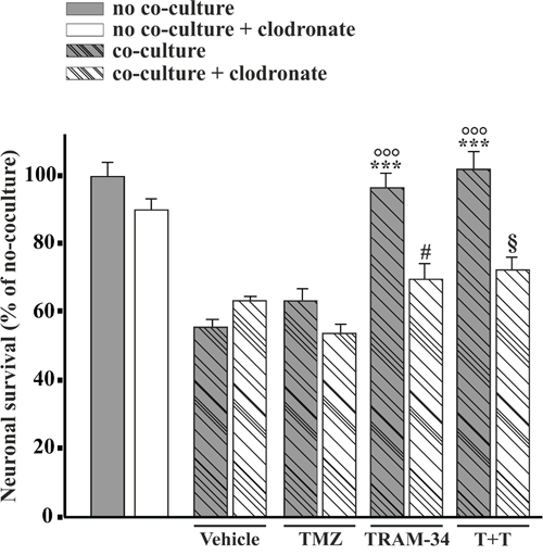 Figure 5: Microglia cells mediate TRAM-34-induced neuroprotection against GBM toxicity. Hippocampal cultures, treated with empty (grey bars) or clodronate-filled liposomes (white bars) were co-cultured or not (C) with GL261 cells and treated with vehicle, TMZ, TRAM-34 or both (T+T). Results are expressed as percentage of cell survival, taking C as 100%. ***p<0.001; # p<0.05; § p<0.05; °°° p<0.001; n=3, One-Way ANOVA, Student-Newman-Keuls post-test.