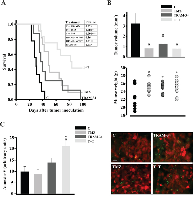 Figure 6: TRAM-34 and TMZ/TRAM-34 treatment increases survival of GL261-bearing mice. A. Kaplan-Meier survival curves of glioma bearing mice treated with vehicle (control, C), TRAM-34, TMZ or both (T+T) (n=8-11, log-rank test results are shown in the inset). B. Glioma bearing mice, 21 days after glioma cell inoculation, were analyzed for tumor volumes (upper panel; * p<0.05 vs C; n= 7, One-Way ANOVA, Student-Newman Keuls post-test) and mouse weight (lower panel; *p<0.05 vs C; n=10-11, One-Way ANOVA, Student-Newman-Keuls post-test). C. Glioma bearing mice, 21 days after glioma cell inoculation, were analyzed for apoptosis. Brain slices (tumor core) obtained from mice injected with GL261-RFP cells (red) treated with vehicle (control, C), TRAM-34, TMZ or both (T+T) analyzed for immunofluorescence of Annexin V (green, bar =10 μm); results are expressed as arbitrary units obtained by the ratio between Annexin-V positive area and tumor area analyzed; * p<0.05 vs C; ° p<0.05 vs TMZ n= 3, One-Way ANOVA, Student-Newman Keuls post-test.