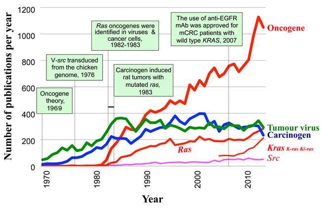 Figure 1 shows yearly tabulated numbers of publications extracted from the PubMed database from 1969 to the present, using the keywords “human carcinogenesis” plus one of the following: “oncogene, ” “carcinogen, ” “tumor virus, ” “ras, ” “src, ” or “kras/k-ras/ki-ras.” In 1969, the word “oncogene” was introduced by Huebner and Todaro [37] to explain the mechanism underlying carcinogenesis. The figure shows how the word was integrated into human cancer research.