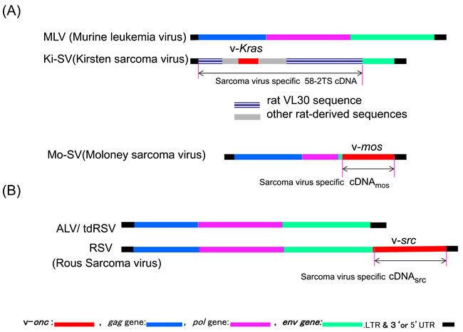 Figure 2: Comparisons of Ki-SV, Mo-SV, RSV, and the corresponding leukemia viral genomes. A. Genomic structures of Murine leukemia virus (top structure), Kirsten sarcoma virus [17, 72], and Moloney sarcoma virus [141]. B. ALV/tdRSV (avian leukemia virus/transformation defective RSV, the upper structure) and RSV (bottom structure). Leukemia viruses/tdRSV mutant genomes are shown for comparison. Each sarcoma virus figure shows regions covered by sarcoma virus-specific cDNA by an arrow.