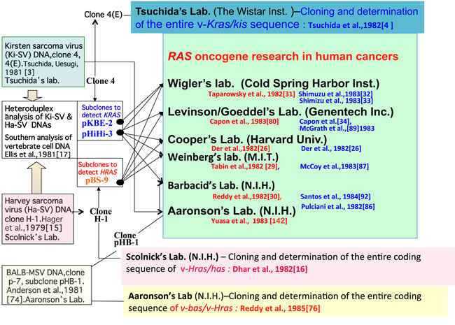 Figure 4: Identification of the viral ras oncogenes and distribution of sub-clones. Cloning of viral genomes and identification of their oncogenes were performed in the laboratories of Tsuchida (v-Kras), Scolnick, (v-Hras), and Aaronson (v-Bas/v-Hras). Subclones containing viral oncogenes (pHiHi-3, and/or pKBE-2 of v-Kras, pBS-9 of v-Hras) were used in the laboratories of Wigler, Cooper, Weinberg, and Levinson/Goeddel. The laboratories of Aaronson and Barbacid used their BALB-MSV clone pHB-1 for HRAS/BAS detection and clone 4(E) and HiHi-3 for KRAS detection. Publications of RAS genes from these eight laboratories are listed as references (indicated in red for HRAS/BAS and in blue for KRAS.