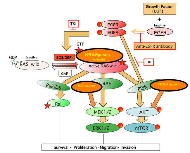 Figure 5: Growth signaling and mutated signal proteins that confer resistance to anti-EGFR-targeted therapy in mCRC. Growth factor stimulation in the normal cell generally proceeds as follows: (i) activation of the receptor by phosphorylation and dimerization, (ii) activation of RAS and PI3K, and then (iii) activation of the RAS effector pathways RAF, PI3K, and RALGDS through binding to RBD of each protein. In mCRC, EGFR copy number was often increased. EGFR-targeted therapy prevents steps (i) and (ii) by using anti-EGFR monoclonal antibodies (mAb) or a tyrosine kinase inhibitor (TKI). An oncogenic driver mutation of the EGFR effector (KRAS, NRAS, or PIK3CA) or the RAS effector (PIK3CA or BRAF) makes cancer patients refractory to EGFR-targeted therapy, while patients with wild-type KRAS/ NRAS/PIK3CA/BRAF are mostly sensitive to this therapy. Activated tumor driver proteins are shown as frames with thick lines. Refer to the text for details.