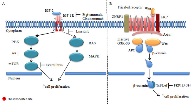 Figure 1: IGF-1R and Wnt/Frizzled receptor pathways. A. In adrenocortical carcinoma cells IGF2 binds to IGF1 receptor (IGF1R) family. IGF-1R has a tetrameric structure in which the intra-cellular β-chain tyrosine kinase activity regulated by ligand binding to extra-cellular α chain. Downstream of these receptors are the well-known Akt and MAPK intracellular signaling networks, which when activated promote cell proliferation. B. The Wnt proteins, by binding to frizzled receptors and the LRP co-receptor, act to suppress the activity of glycogen synthase kinase-3β (GSK-3β). ZNRF3 promotes degradation of Wnt receptor functioning as tumor suppressors. This prevents phosphorylation of downstream molecules allowing β-catenin association with Tcf/Lef in the nucleus and subsequent increased cell proliferation.