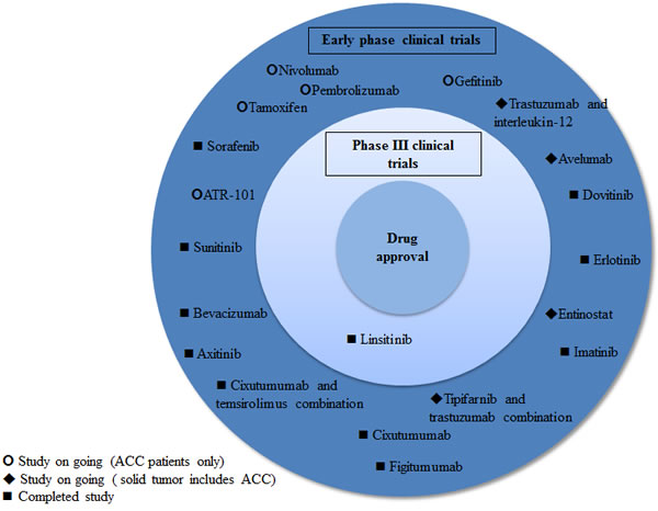 As reviewed above, many early phase studies have been conducted in ACC in the past years, but no breakthrough targeted therapy trial has been reported thus far (Figure 2). IGFR, while a promising target given the high IGFR/mTOR pathway activation in ACC, failed as predictive marker of benefit with anti IGFR therapy.[40] The phase III trial of linsitinib versus placebo in ACC was closed due to the lack of demonstration of overall survival benefit at interim analysis.[48] The simultaneous targeting of the IGFR and mTOR showed more promising results in one phase I trial with 11 out of 26 patients experiencing stable disease after 6 months of therapy, suggesting potential efficacy from combinatory strategies.[55] Agents targeting the VEGFRs and other tyrosine kinase receptors such as cKIT, EGFR and FGFR have not shown significant antitumor activity. [63, 65, 67, 68, 72, 78, 83] While interesting pre-clinical data of other potential targets for ACC (e.g., steroidogenic factor 1, c-Met pathway, estrogen receptors, DNA methylation) are emerging, an expansion of immunotherapy translational studies would also be desirable.[92, 106, 109, 116, 131]