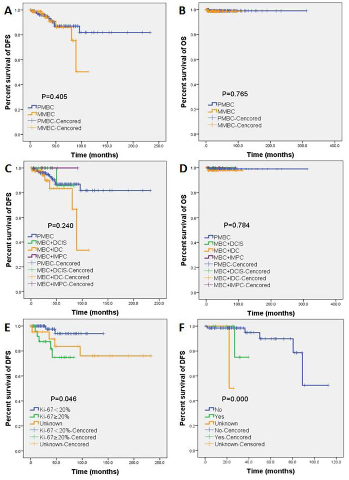 There were 197 MBC patients, including 117 PMBC and 80 MMBC, in the study cohort. The clinicopathological characteristics, treatment choice, DFS and OS were compared both between 117 PMBC vs 80 MMBC, and among all MBC subgroups, including 24 MMBC with DCIS and IDC (with or without other types of carcinoma), 45 with only IDC and 9 with IMPC. Two patients with MMBC and ILC were excluded from the comparison due to the small case number. DFS factors of PMBC and MMBC were identified respectively. Identification of prognostic factors for MMBC subgroups were not performed also due to the limited case numbers (Figure 1).