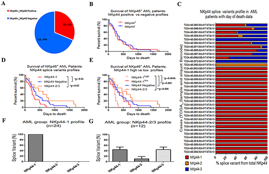 Figure 1: Poor survival of AML patients with the NKp44-1 profile. RNAseq analysis of PB samples obtained from AML patients (TCGA data): A. Proportions of NKp46+NKp44+ (n=51) and NKp46+NKp44- (n=115) patients from all NKp46+ AML cases. B. Of the AML patients in panel (A), only 36 patients from the NKp46+NKp44+ group (Red) and 60 patients from the NKp46+NKp44- group (Blue) had the “day to death” information, which were plotted (difference is not statistically significant). C. Percentage of NKp44 splice variants [NKp44-1 (Red), NKp44-2 (Orange), NKp44-3 (Blue)] from the total NKp44 mRNA expression for NKp46+NKp44+ AML cases that included the day to death information (n=36). Each line designates the analysis for one patient TCGA sample and corresponding barcode. D. Survival of NKp46+ AML cases with a profile of NKp44-1 (red, n=24) vs. NKp44-2/3 (orange, n=12) vs. NKp44- (blue, n=60). E. Survival of NKp46+ AML cases with differential profile of NKp44-1 after normalization to NKp46/NCR1: NKp44-1high(dotted red, n=12) vs. NKp44-1low (solid red, n=12). NKp44-2/3 (green, n=12) vs. NKp44- (blue, n=60) profiles (from E) are re-plotted for the ease of comparison. F. Incidence of NKp44 splice variants in the NKp44-1profile group (F) and the NKp44-2/3 profile group G. The NKp44-1 profile group shows solitary mRNA expression of the NKp44-1 splice variant while the NKp44-2/3 profile group shows similar mRNA levels of NKp44-1 and NKp44-3 splice variants. A highly significant correlation was shown between the NCR2 mRNA expression and the total NKp44 expression (Pearson r = 0.9996, p < 0.0001, n = 36, graph not shown). Percent survival vs “day of death” statistics were calculated using the Log-rank (Mantel-Cox) Test. mRNA expression statistics were performed using Unpaired t test, two-tail.