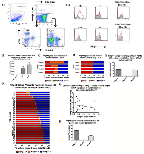 Figure 2: Human primary NK cells and clones exhibit diverse NKp44 splice variant profiles. A.i. Flow cytometry-based analysis of PBMC, representative histogram from a healthy donor (n=4). Gating of PBMC subpopulations was performed using the following markers: 7AAD, CD3, CD19, CD56, HLA-DR and NKp44. A.ii. Total NKp44 protein expression is shown by histogram of each PBMC subpopulation on day 0 (filled grey) and following 3 days of culture with IL-2 (blue line) or with IL-15 (red line). * Some CD4 T cells express HLA-DR. B. qPCR analysis of total NKp44 mRNA expression on day 0 PBMC and following 3 days of culture with IL-2 or IL-15. qPCR analysis of NKp44 splice variants percentages in PBMC: C. day 0, D. after 3 days of IL-2 culturing. NKp44-1 (red), NKp44-2 (orange), NKp44-3 (blue). E. NKp44 splice variant profile after IL-2 culturing, of the 4 healthy controls pooled together shows co-dominant expression of NKp44-1 and NKp44-3. F. NKp44 splice variants profiles of 27 human NK clones from one healthy control. Human NK cell clones were cultured in the presence of IL-2, PHA and irradiated PBMC and RPMI8866 cells. NKp44-1 (red), NKp44-2 (orange), NKp44-3 (blue). G. Lack of a correlation between NKp44 total mRNA expression and NKp44-3/NKp44-1 ratio in NK cells clones (Pearson r = 0.09, p =0.6985, n=27). H. NKp44 splice variant profiles of the 27 human NK cell clones of one healthy control pooled together shows dominant expression of NKp44-1 relative to NKp44-2 and NKp44-3.